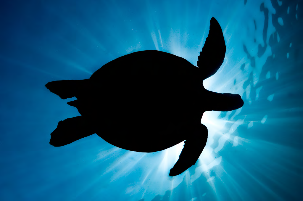 Conversely, this dark silhouette of a green sea turtle contrasted against bright blue water helps make this shot a winner.