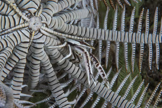 surroundings. Recognizing those scenarios is a useful skill. It certainly is not wrong to capture images of these creatures, but no one wants every image in their library to be like this shot of a black and white crinoid squat lobster on a similarly patterned and colored crinoid.