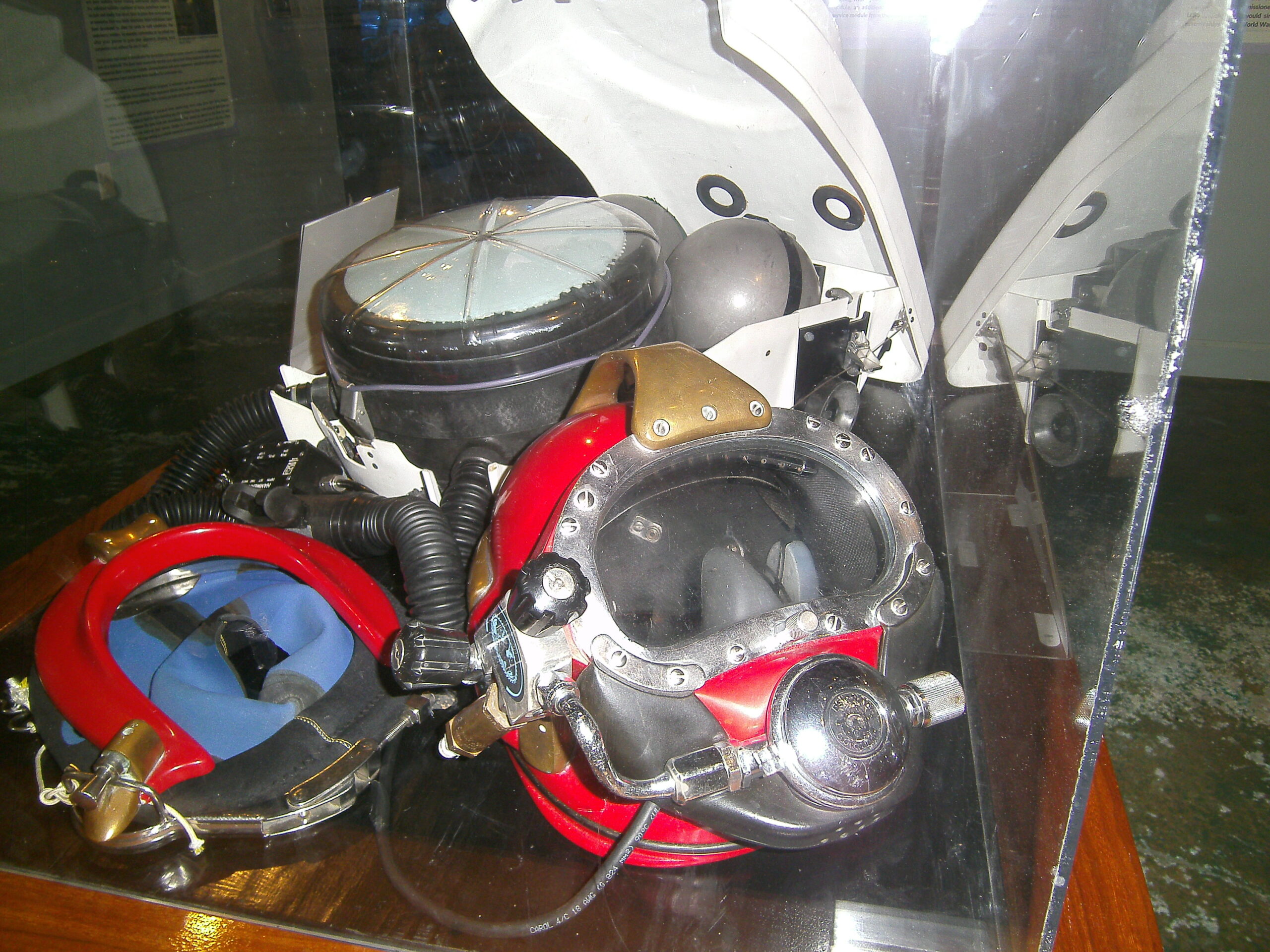 Also on display is NASA’s MK 16 rebreather and SuperLite 17 helmet, used for underwater astronaut training. This equipment, similar to those used by modern divers, underscores the integral connection between diving and space exploration.
