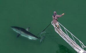 It wasnโt until 2004 when Skomal was relaxing at home one summer evening when he received a call saying there was a possible great white shark in a small salt pond not far from Woods Hole. He didnโt believe it at first, but less than 24 hours later, he was staring at a live 13-foot great white that was trapped in this small pond. As a result, Skomal became the first person to tag a great white in the northern Atlantic with a high-tech satellite tracking tag. He and his team were successfully able to guide the leviathan back to its rightful home in the open ocean, but unfortunately for him, that tag was a dud, and they never received the data from that particular shark. Skomal was devastated, thinking it might be his only chance to tag a great white like that.