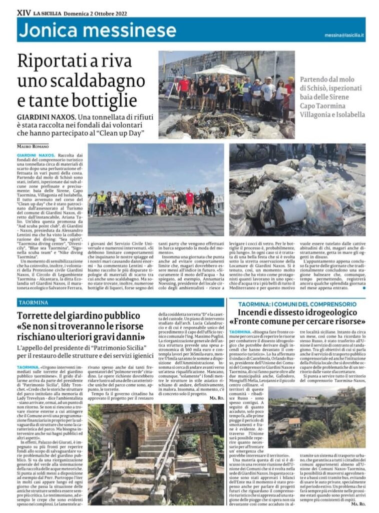 With great pleasure I, Roberto Baraldi, report the success obtained in the day of cleaning the seabed of Naxos and Taormina organized by Divesicily (NAUI # AF1271) of Giardini Naxos and Taormina, Messina, Italy. Attended by all the diving schools and diving centers of the area including: cultural associations as Legambiente, the team of divers from the military base of Sigonella (to which the municipality of Giardini Naxos has donated a plaque) and various voluntary associations.