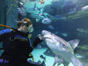 Immerse yourself in the largest exhibit at the aquarium, a 200,000-gallon seawater system that mimics the coral reef you can find right off the coast of the Florida Keys. Guests can choose to dive or snorkel in this encounter, making it perfect for any age. Either way, guests interact with multiple species of rays, fish and sharks. They are geared up with equipment supplied by the aquarium and then begin their tour of the tank with one of the aquarium’s dive instructors.
