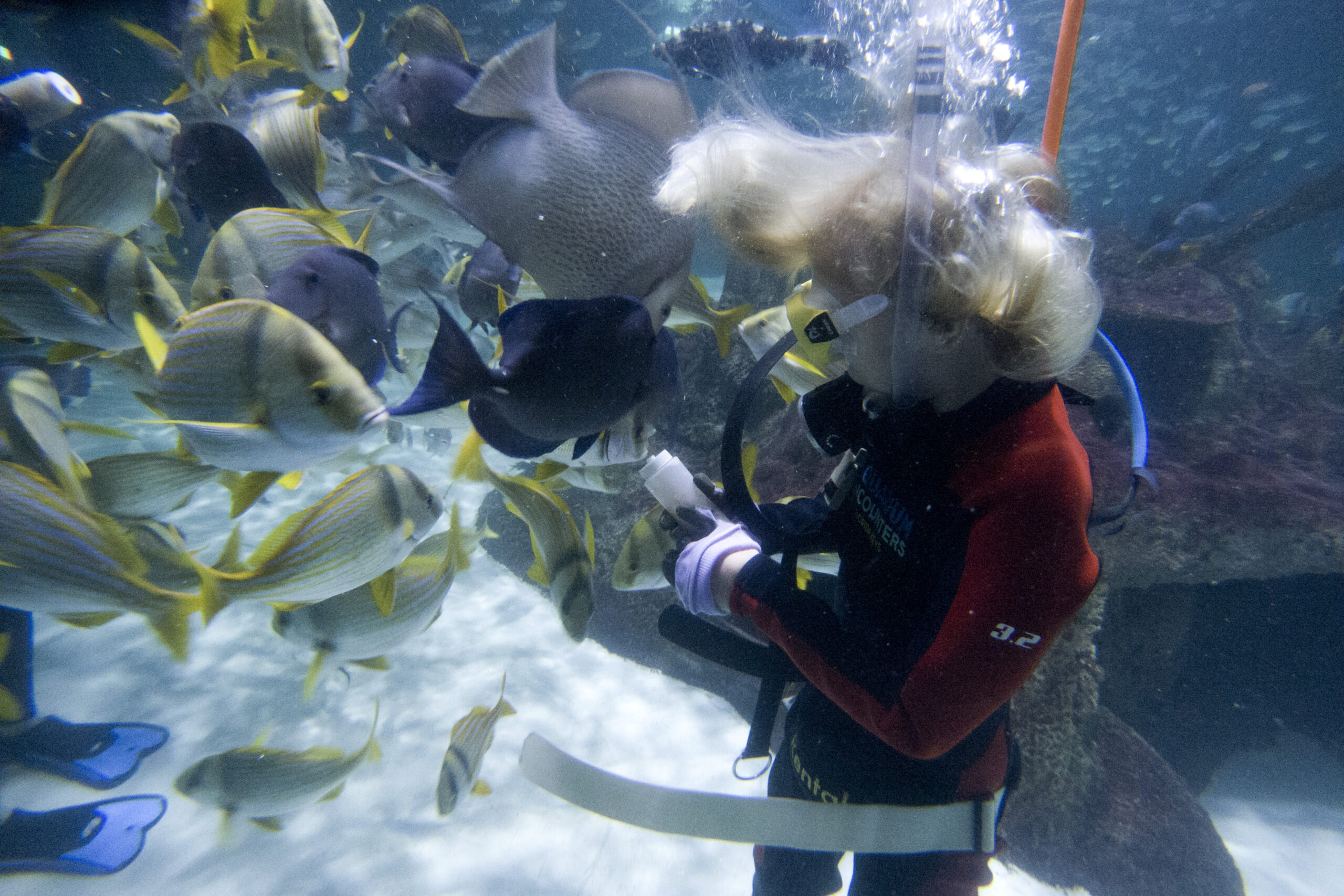 Once the reef fish are nice and full, the divers will head over to the acrylic shark-feeding windows. Directly in the center of this 200,000-gallon seawater system are two acrylic windows that separate the coral reef from the predator reef. This 3-inch acrylic window is all that separates the divers from the sharks, eels, groupers and more. These specialized windows are designed with two feeding holes, one near the top for snorkelers and one at the bottom for divers. All of the sharks, eels, and groupers are trained to eat from the window, and when hungry, they can create a feeding frenzy for the guests, taking food as it is passed through the window.