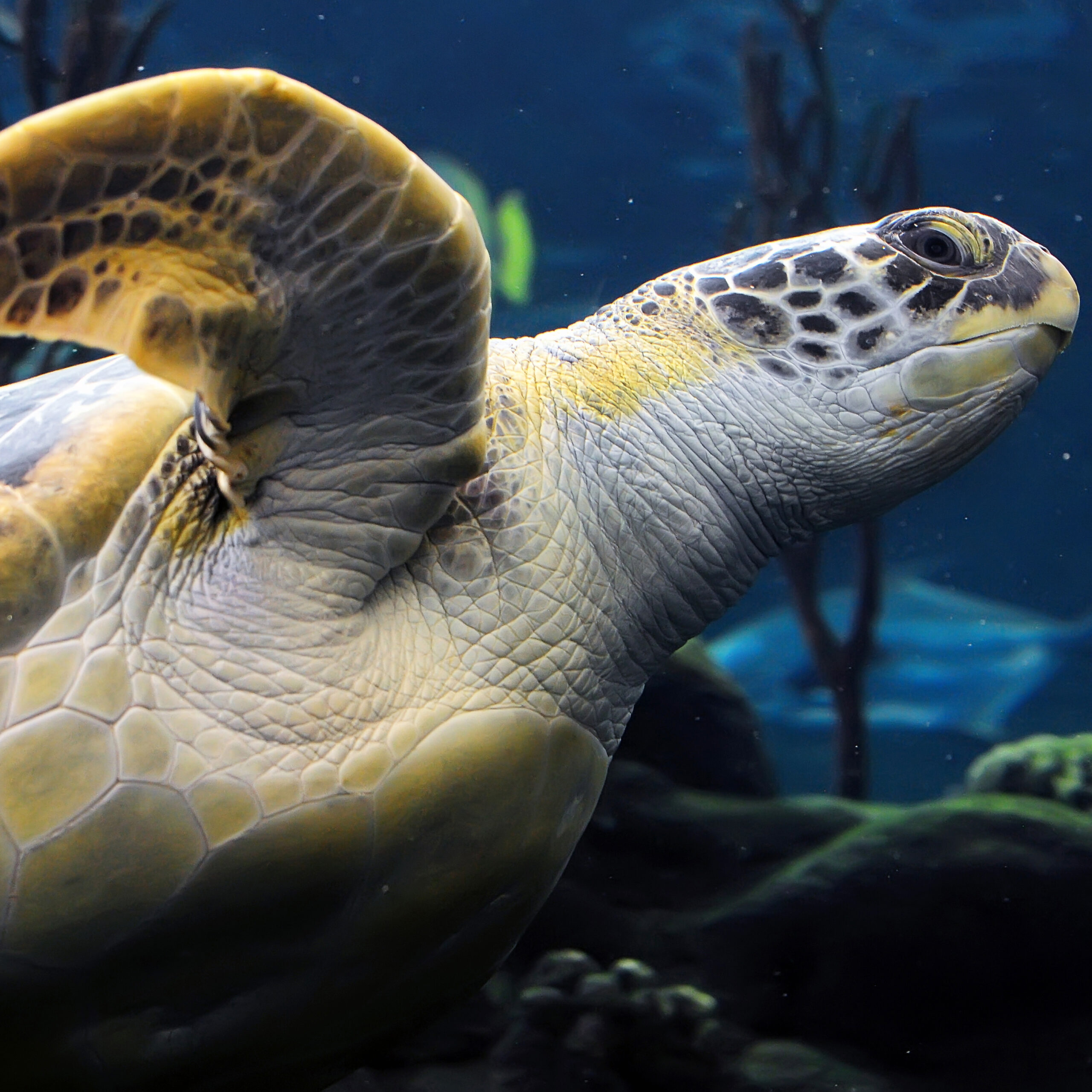 ยฉ The Florida Aquarium Guests can get this close to The Florida Aquariumโ€™s resident sea turtle Flip during the Shark Dive program. Both experiences take guests into a 500,000-gallon coral reef habitat where guests will swim or dive side by side with many types of sea life native to Florida, including hundreds of reef fish, a green sea turtle, moray eels, sand tiger sharks and more.