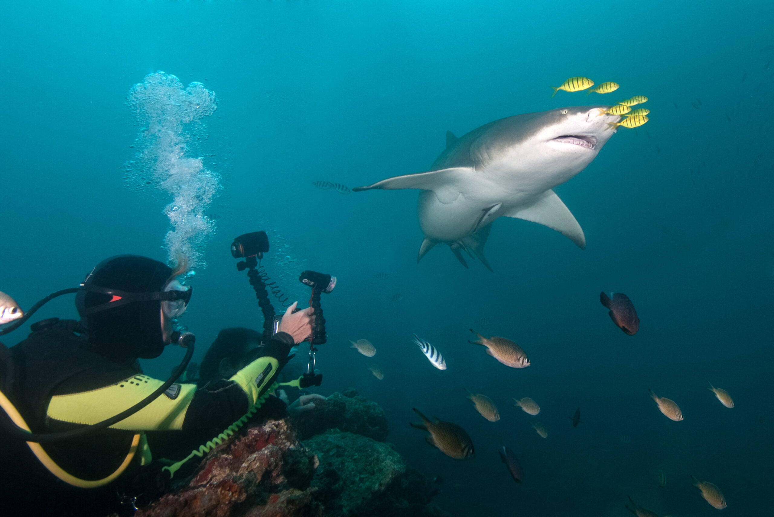 Within a 15- to 30-minute boat ride from Waidroka, divers regularly explore spectacular walls, pinnacles, swim-throughs and coral gardens. Fiji is one of those destinations where divers canโt decide whether to look around in the blue or focus on finding tiny critters because both pelagics and macro subjects abound on these reefs. Thereโs even a wreck to explore, the Tasu II, or a dive in the Twilight Zone โ a site not decorated with pretty corals, but rather alien-looking volcanic formations. At the Twilight Zone, the payoff is an encounter with any one of the regular inhabitants of this reef: schools of barracuda, eagle rays, stingrays, leopard sharks, guitar sharks, whitetip reef sharks, grey reef sharks or turtles. As good as the diving is and as wide a range of underwater sights as there are to see, Waidrokaโs unique experience doesnโt stop there.
