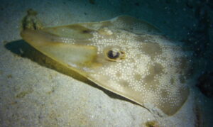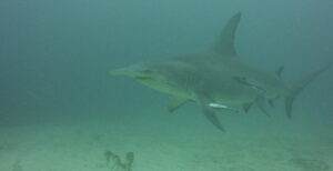 “Aren’t you afraid of sharks?” is a question asked by non-divers all the time. My answer usually explains that the shark behavior shown in exciting film clips on YouTube or television is provoked by feeding or chumming the water. While feeding marine creatures by divers in Florida’s territorial waters is illegal, beyond three miles out it is allowed. Shark feeding dives are popular although controversial. Normal shark behavior does not follow feeding-frenzy stimulated activity. It is often hard to get a good close-up photograph of a large shark underwater before it sees divers, feels vibrations from their exhaled bubbles, and swims quickly away. While pelagic sharks are not usually associated with distinct territory, many large sharks have been consistently seen at certain times of the year on specific reefs.
