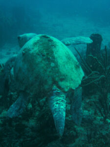 Gigantic! — the loggerhead turtle’s tail at the base is bigger around than my hands, thumb and forefingers spread wide. I’ve logged the big fella’s return to the same reefs off Ocean Ridge, Florida, over the last 26 years.