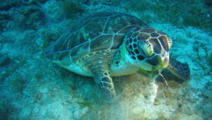 Loggerhead, green, hawksbill, and leatherback turtles are prevalent. The females nest on beaches all along the coast, and nest predation is a main peril of all sea turtle species. The loggerheads are also in danger from Cuban tortugueros and other Caribbean islanders that relish turtle meat. Marine turtle species are all on various endangered lists and thus protected.