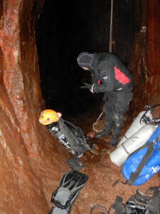 During this first exploration, we reached a depth of 30 meters (100 feet), and we inspected two small parts of two side tunnels. We suspect that the bottom of the mine may be as much asz` 150 meters (500 feet) deep, but that is only a best guess; it could be far more.