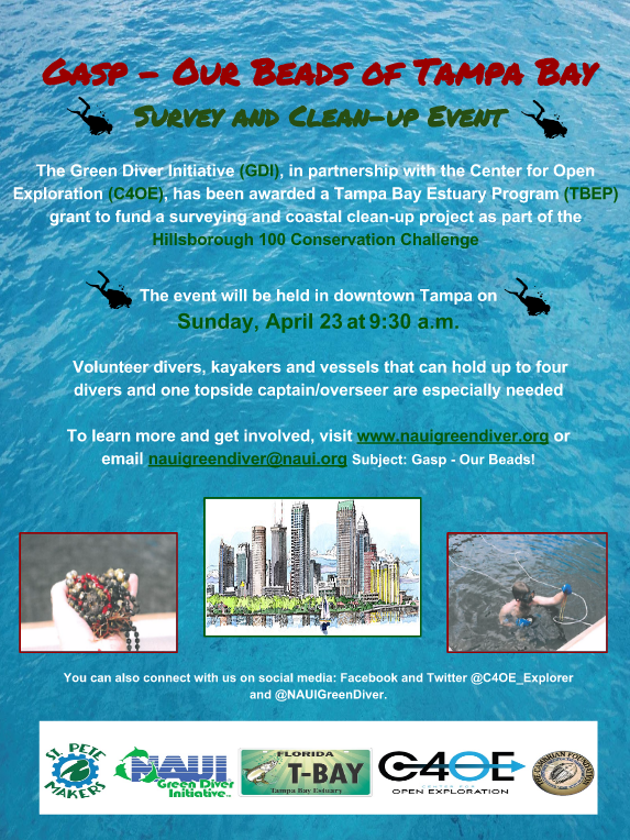 To learn more about this collaboration and get involved in the Gasp-Our Beads of Tampa Bay surveying and clean-up event, visit www.nauigreendiver.org or email .gro.1761610507iuan@1761610507revid1761610507neerg1761610507iuan1761610507