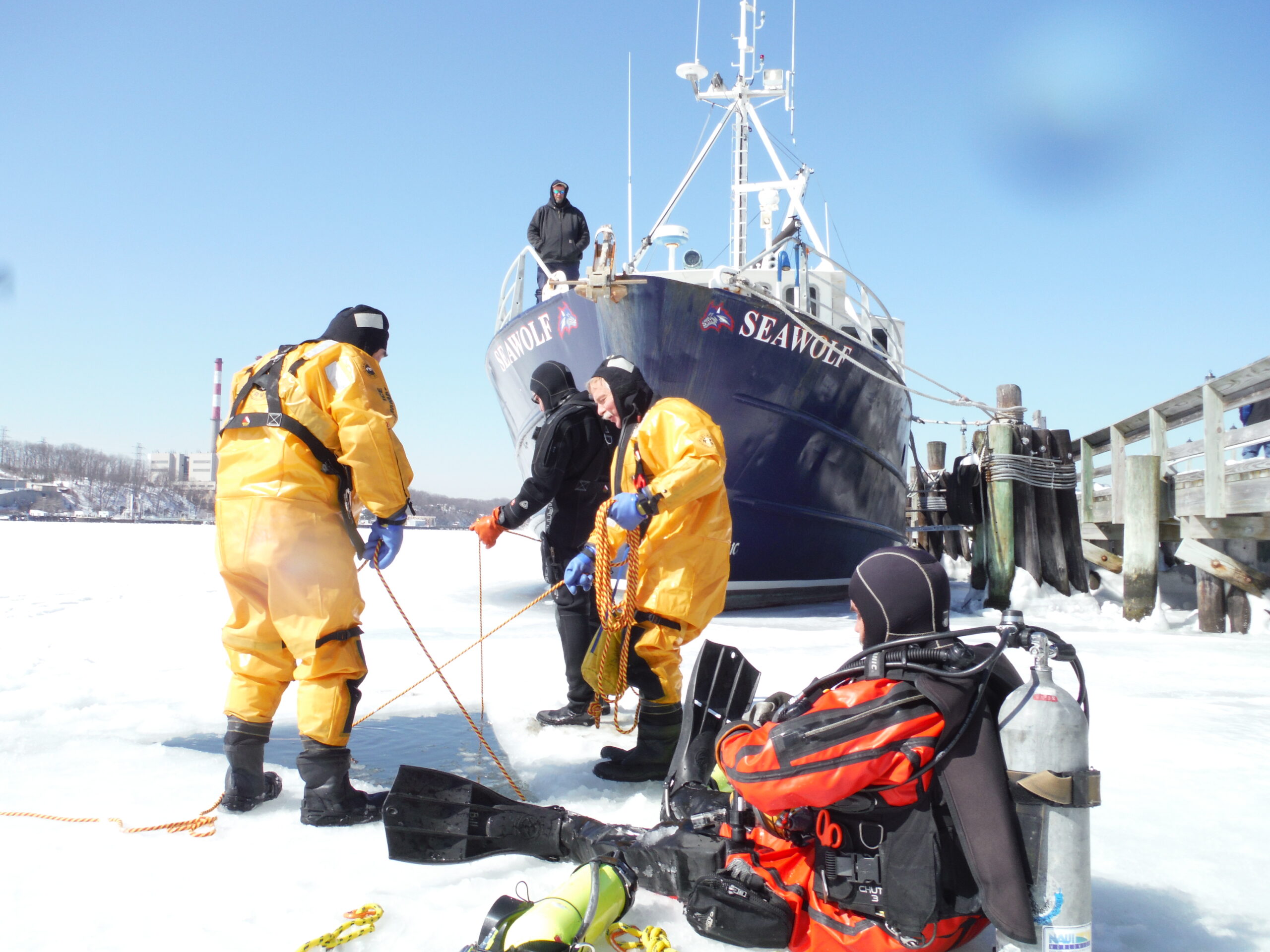 Such was the case in 2015. After completing a NAUI Recreational Ice Diver course with students Jason Northgard, Todd Brush, Greg Tellone and Jeremy Davila at Lake Ronkonkoma, we were all pretty motivated to continue our ice diving adventures. Thatโs when I got a call from Capt. Chris Harter, who runs the R/V Seawolf during scientific diving operations that I supervise for Stony Brook University. It seems that for the first time since 1977, the R/V Seawolfโs home port of Port Jefferson Harbor was completely frozen over, and the 140-ton R/V Seawolf was stuck at the dock. Attempts to free her had been fruitless, her Cummins K38 V-12 dieselโs 800 continuous horsepower had only been able to push her about 8 inches through the ice. This I had to see!