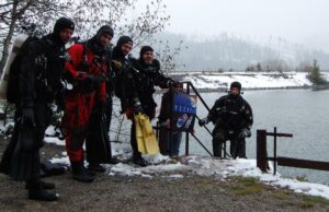 NAUI tech divers from Czech Republic visiting the reservoir in Dedinky, Slovakia, for a spring dive. Only a little snow, no ice, water temperature 5 degrees Celsius (41ยฐ F), air freezing. Unfortunately, visibility was no better than a meter (3 feet), but it was a great way to say goodbye to the winter.