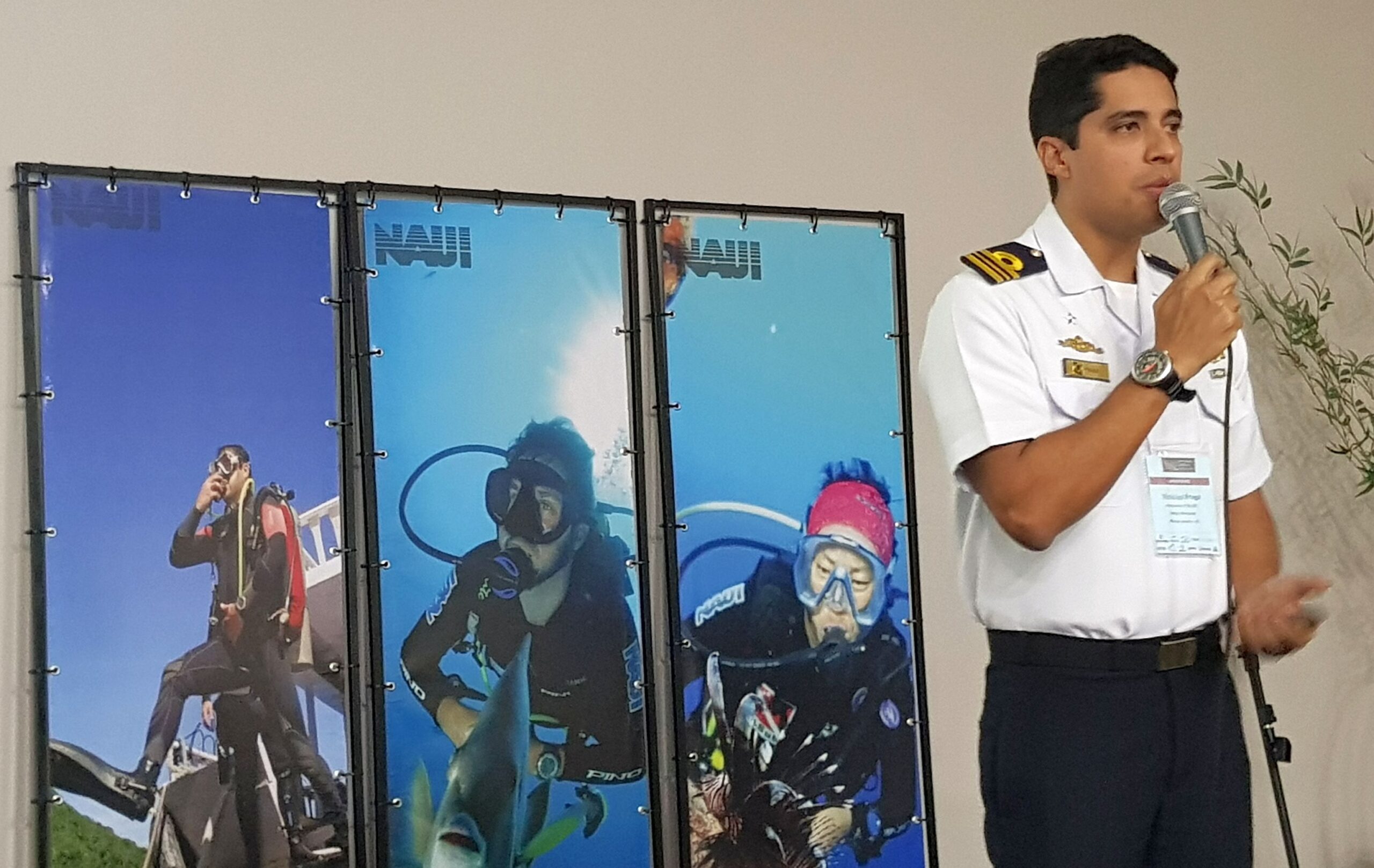 The weekend’s general plenary aeaaion was devoted to lecture presentations and roundtables addressing technical, safety, and administrative topics relevant to diving. A highlight was the presentation on the Brazilian base in the Antarctic, given by Brazil Navy Cmdr. Luis Filho and Sub Cmdr. Israel Levi de Oliveir, both NAUI members, who, in addition to their mission for Brazil to the frozen landscapes, took the opportunity to plant the NAUI flag there โ making everyone very proud!