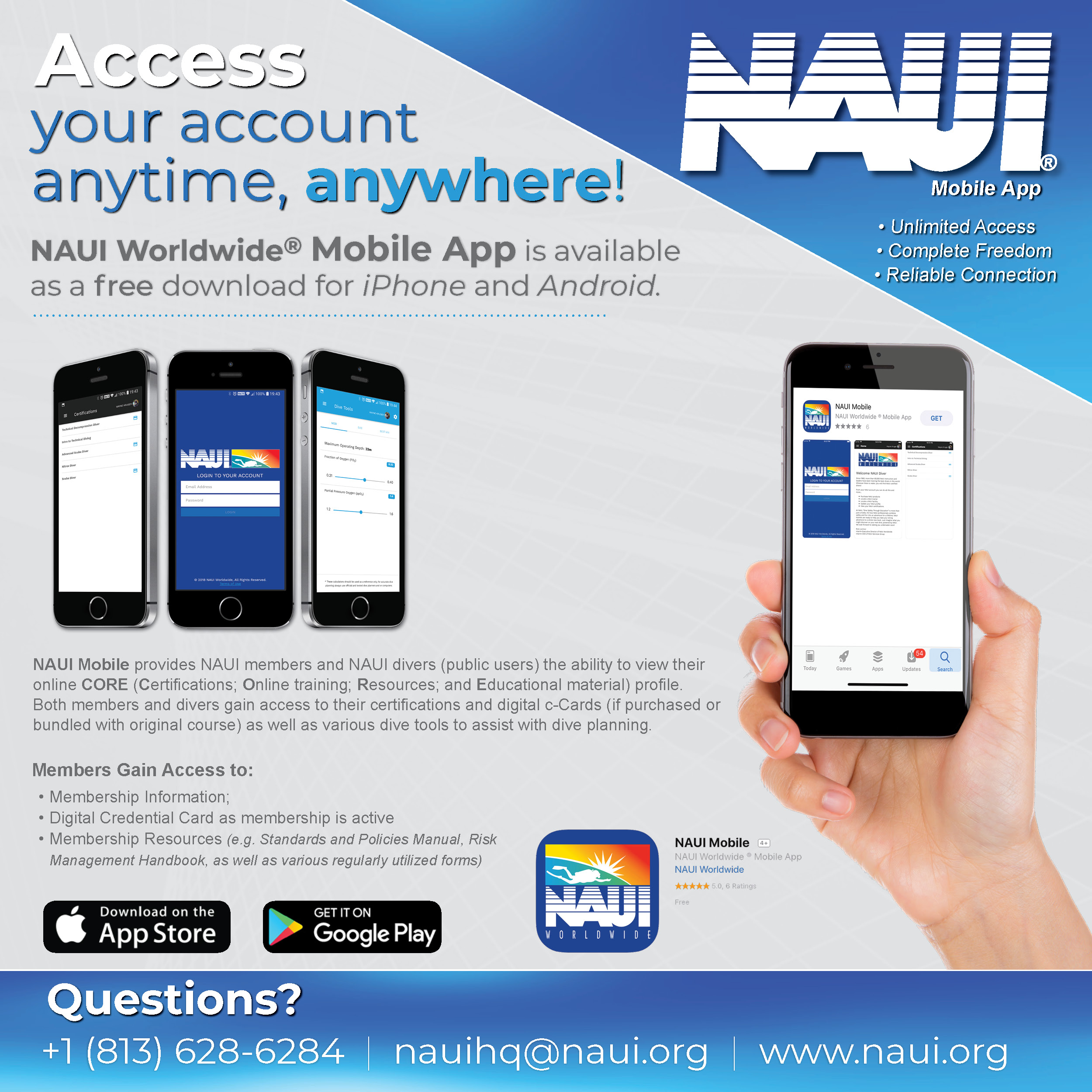 NAUI Worldwide Mobile App is available as a free download for iOS devices in the iTunes App Store and Android through Google Play.