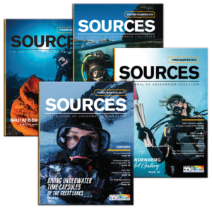 Sources: The Journal of Underwater Education is an international publication of the National Association of Underwater Instructors. Sources provides NAUI members, affiliate businesses, and divers around the world with member-contributed information covering topics like NAUI leadership and dive training practices, the aquatic environment, diving education, dive career development, dive culture, business development, equipment innovation, and more.