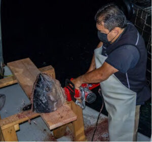 Before sunrise (5:00 AM) on the first diving day, guests are invited to watch what the crew refers to as the โTuna Massacre.โ This is where the crew prepares approximately 600 lbs./273 kg of frozen yellowfin tuna that they purchase locally in Ensenada. This is done in assembly line fashion. One crew member uses a chain saw to cut the frozen tuna into sections while another drills holes in the tuna section while yet another attaches a section of hemp rope to the tuna section. These tuna sections will be attached to a polypropylene rope and float to be used during โshark wrangling.โ