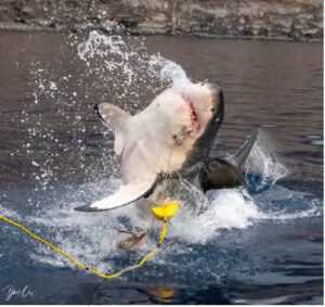 Things got off to an exciting start with large great white sharks taking the frozen tuna from the โwranglersโ and breaching before the first diver got into a cage. This was a sure indication that this was going to be a great trip! By 8:00 AM, there had been multiple great white shark breaches!