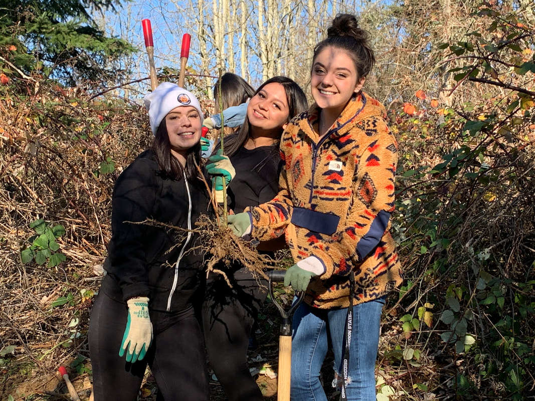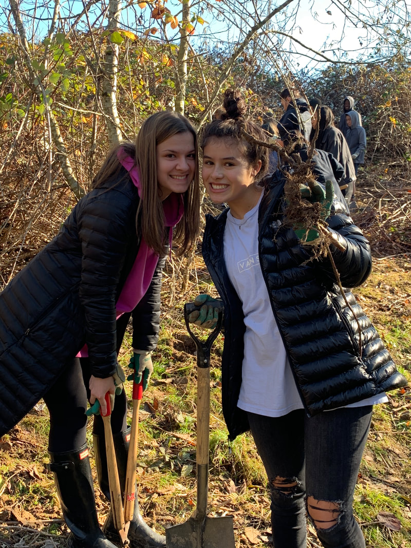 As part of the class’ philosophy, that learning is enhanced through the Stewardship Model, the class adopted an area at the headwaters of a stream that directly drains to salmonid and lamprey bearing streams.ย The project has 4 phases, Phase 1 is the removal of roughly a half-acre of the invasive Himalayan blackberry.ย This plant along with many other invasives limit habitat diversity by taking over an area as well as increase erosion in the area by having a uniform root depth.ย Phase 2 will be planting a diverse more than 400 native plants on the site.ย Finally mulching the trees in the spring to keep the soil moist and reduce weed competition (phase 3). This will be followed by general site maintenance that involves replacing trees that don’t survive their first year and keeping the blackberries from reclaiming the areas while the native plants are allowed to grow and reclaim the site (Phase 4).ย Native plants provide the habitat requirements for native wildlife including salmon and lampreys.