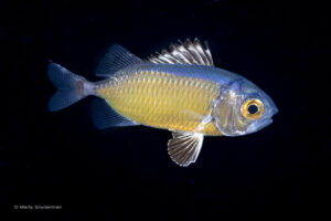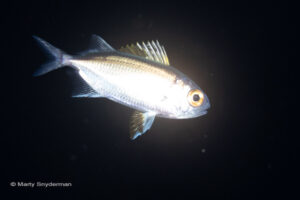 While you never know what animals might be encountered on a given night, some commonly encountered creatures include larval jacks, filefishes, seahorses, moray eels, octopuses, mantis shrimps, sea jellies with accompanying fishes, shrimps and crabs, comb jellies, larval lobsters, chambered nautiluses, pyrosomes, squids, octopuses, and more.