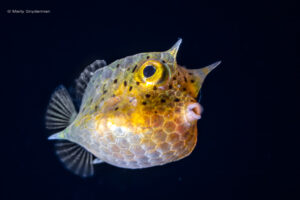 It is also challenging to keep subjects in a frame as the field of view of a macro lens is rather narrow and many subjects such as this post-larval trunkfish are active swimmers.