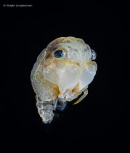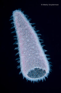 The same is true of some larval fishes. So, wide open apertures that gather as much light as possible become necessary to attain proper exposures. Of course, a wide aperture with a macro lens results in a thin depth-of-field. Conversely, highly reflective subjects- and there are plenty of those- necessitate closed-down apertures and changing the angle of orientation to get the desired image. Bracketing exposures, reviewing results, making the necessary adjustments before moving on to look for another subject, and shooting a lot of frames of the same subject are often keys to creating a photograph that pleases you.