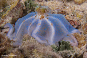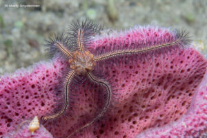 As a nighttime photographer, your challenge is to determine the best approach for each potential subject. Over the years I have found that it often works well for me to try to illuminate a potential subject with the dim, periphery of the beam emitted by my dive light when I first encounter it. I watch closely to see how my potential subject reacts. If my quarry freezes like a โdeer in the headlightsโ I can often use the brightest power setting on my dive light and point the light directly at my subject. This technique makes composing and focusing relatively easy.
