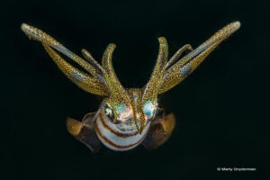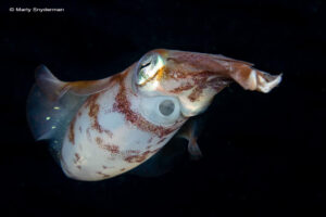 Having a quick-thinking, helpful buddy can be a huge asset when shooting at night. Certainly, it was for me when I made this photograph of a bigfin reef squid (aka longfin reef squid) at night in the Philippines. Sometimes, bigfin reef squid are incredibly cooperative subjects as they face directly into the light, thus looking toward the camera while remaining in place or with very little movement. But that was not the case with this squid. No matter how dim my red-filtered light was or how far into the periphery of my lightโs beam the squid was, this wary cephalopod instantly turned away from me. A butt shot was the best I could do until I turned my light off and my quick-thinking dive buddy positioned himself on the opposite side of the squid and pointed his light at my desired subject. The squid turned away from my buddyโs light, so it faced right at me. I was able to use my buddyโs light to focus and get this shot, an image I was unable to get on my own.