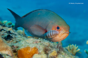 and this image of a creolefish that is carrying a soldierfish isopod on its face.