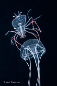 larval slipper lobster riding on a jelly in the open sea at night in the waters off Kona, Hawaii
