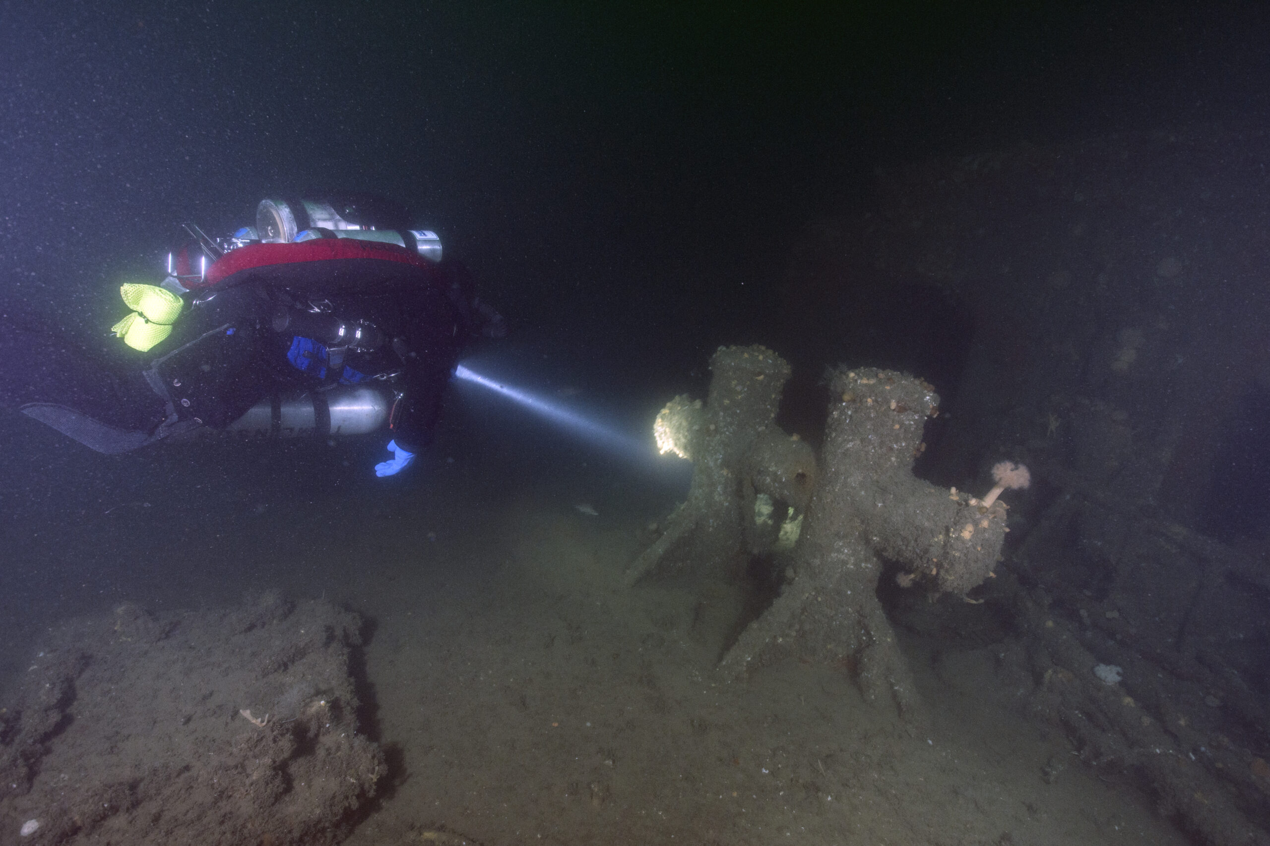 My curiosity got the best of me, and I wanted to look inside these wrecks. To train for wreck penetration, I completed classes to learn how to plan safely and navigate overhead spaces. Instantly, every wreck I had ever explored had new areas to be explored. The Poling has living quarters and galley on the first level with ambient light, multiple exits and easy navigation. The next deck down is the engine space, which has become silted in and my exits are typical with little to no visibility. The equipment and decking of the Pinthis lie on the bottom with the turtled hull overhead.