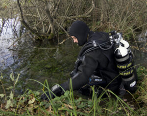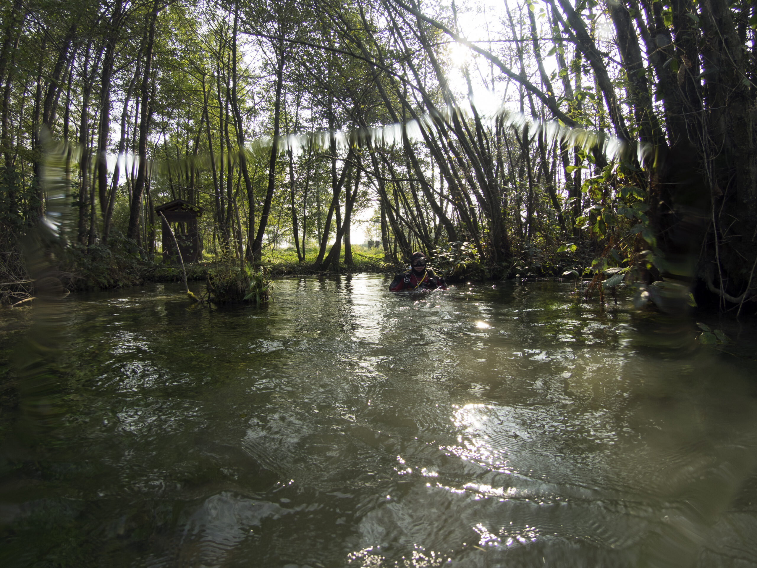 On the day of our dive, our group of divers met on the main road from Cuneo to Chiusa Pesio. Mayor Lorenzo Busciglio of Beinette came with us to show us around the lake and tell of its history. As we approached our dive site, the crystal-clear body of water appeared almost magically in the middle of a green meadow surrounded by trees.