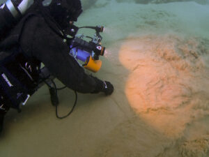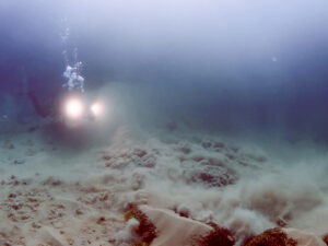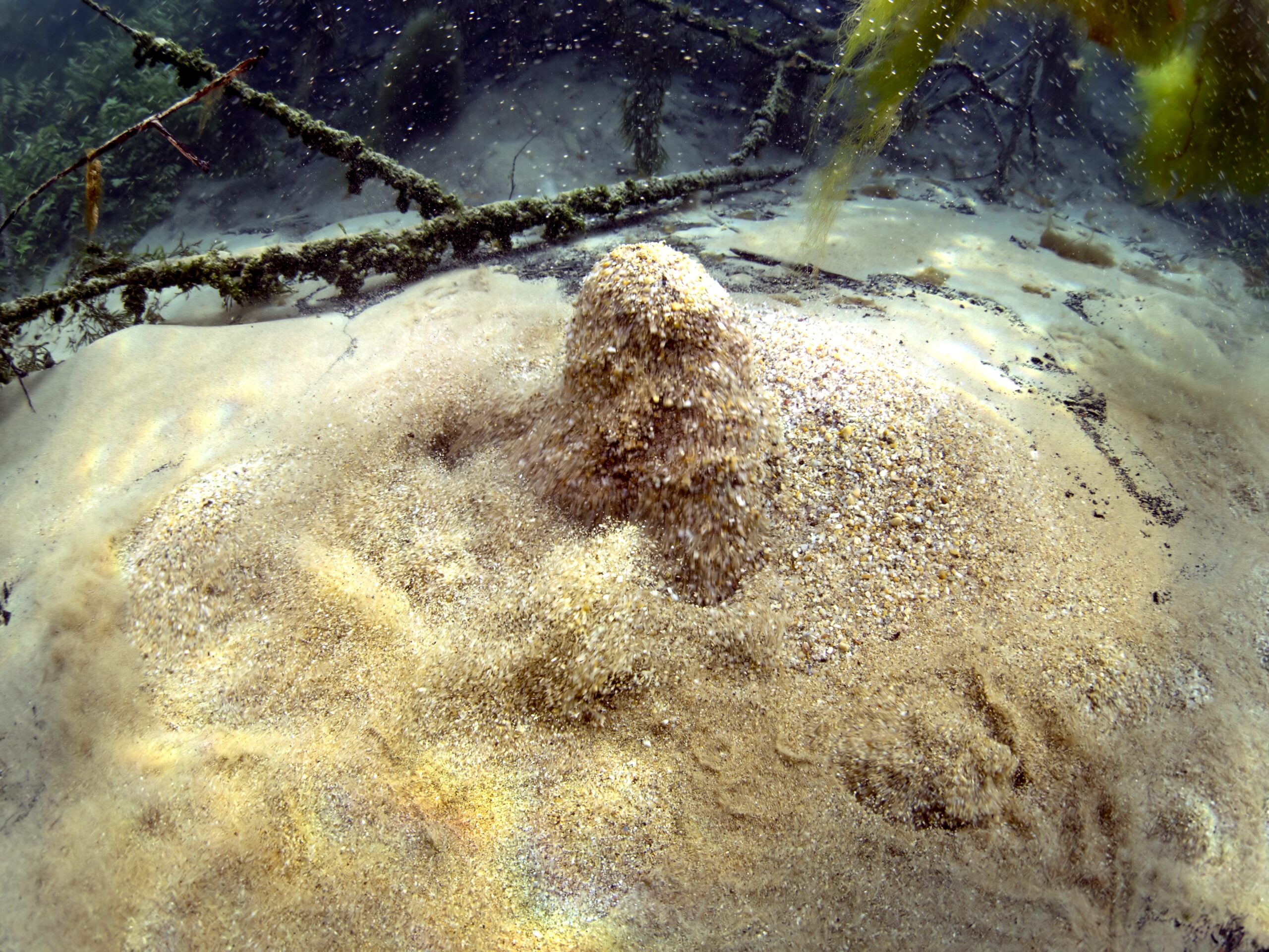 We entered the water and swam over the bottom. The visual impact of the underwater springs and the whole general scene was remarkable: The bottom seemed to rise up of itself and bubble like a pot of fiercely boiling water. From folds between rocks and the substrate, additional billows of sand gushed like some sort of submarine geyser. We moved gingerly closer and tried to understand before touching. Then Claudio’s suggestive tales of his original dive and our natural curiosity took over, and we started playing with the springs in the beautifully clear water and began filming to document them.
