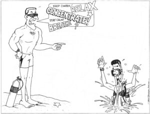 The “quiet rescuer” would consider this scenario from the distressed diver’s point of view. If we could interview a “rescued diver” immediately, we would learn several interesting things: 1) The diver didn’t hear, much less understand, one shouted word. 2) The diver didn’t signal for help for fear of attracting attention and experiencing embarrassment. 3) The diver thought the question, “Are you OK?” ludicrous.