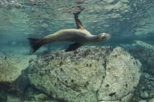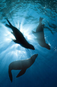 When trying to make a particular photograph, the first thing you need to do is envision the image, and then you need to consider what you need to do to get the shot. Consider the two images of the California sea lions that help illustrate my thoughts. My original idea was to create a compelling silhouette. To get that shot I needed the following: (1) to see strong contrast between a sea lion and its background, (2) reasonably clear water, (3) a high enough light level so that I could use a shutter speed that was fast enough to “freeze” the action and produce crisp lines of delineation between a sea lion and the water that bordered it, (4) a strong upward shooting angle, and (5) an interesting pose from the sea lion.