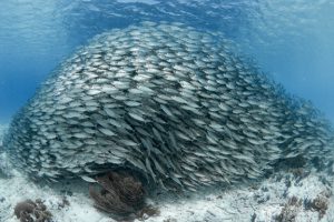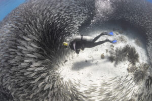 The two photographs of a school of scad illustrate another time when I changed my photographic plan underwater to try to maximize an opportunity. I had been told about the school and could actually see the dark patch in the water they created as they moved down the coast in Bonaire. I thought this was going to a great chance to create an impactful image of a large school of fish swimming in inviting blue sunlit water. I thought the image could convey a sense of “why we dive” that shared the beauty and excitement of diving.