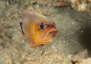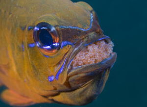 The last two examples are from times when I went back to the surface and changed my lens from a 60mm lens to a 100mm lens in order to make a compelling photograph. In the first example I was diving out of the Atlantis resort in Puerto Galera in the Philippines where I serve as one of our two Photography Ambassadors when I spotted a ring-tail cardinalfish holding a mouthful of eggs. The ring-tail is one of those species in which the male is sometimes referred to as Mr. Mom as it is the male that holds and protects the fertilized eggs of its mate until the eggs hatch.